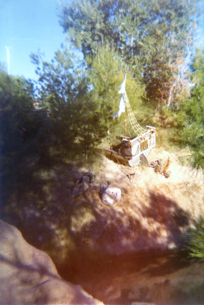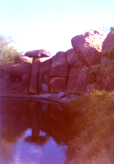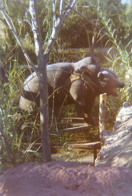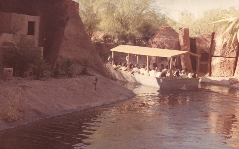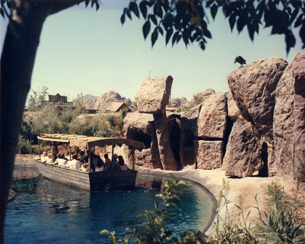 The "River of Legends" river ride was a centerpiece attraction when Legend City first opened. The original ride incorporated a number of defining elements that remained present throughout the entire run of the river ride attraction, such as the Indian attacks and the earthquake. However, after the ride was renamed "Cochise's Stronghold" in the mid '60s, most of the scenes became loosely based on actual place names in southeastern Arizona such as the San Simon River, Fort Bowie and Apache Pass. The fact that the San Simon was not navigable and Fort Bowie never had a port seemed minor details at the time. The water for the river ride came from the effluence of the Phoenix Zoo next door to the park. Heaven forbid anyone ever fell into this cauldron of animal waste! Except where otherwise noted, these photos are courtesy of Dick Kraus, who created many of the animated effects.